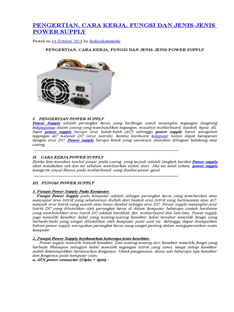 Pengertian power supply fungsi power supply dan cara kerjanya pengertian power supply atau psu merupakan suatu komponen komputer yang mempunyai fungsi sebagai pemberi suatu tegangan serta arus listrik kepada komponen komponen komputer lainnya yang telah terpasang dengan baik pada motherboard atau papan induk sedang tujuan awal dari penyaluran arus listrik ini adalah supaya perangkat atau.